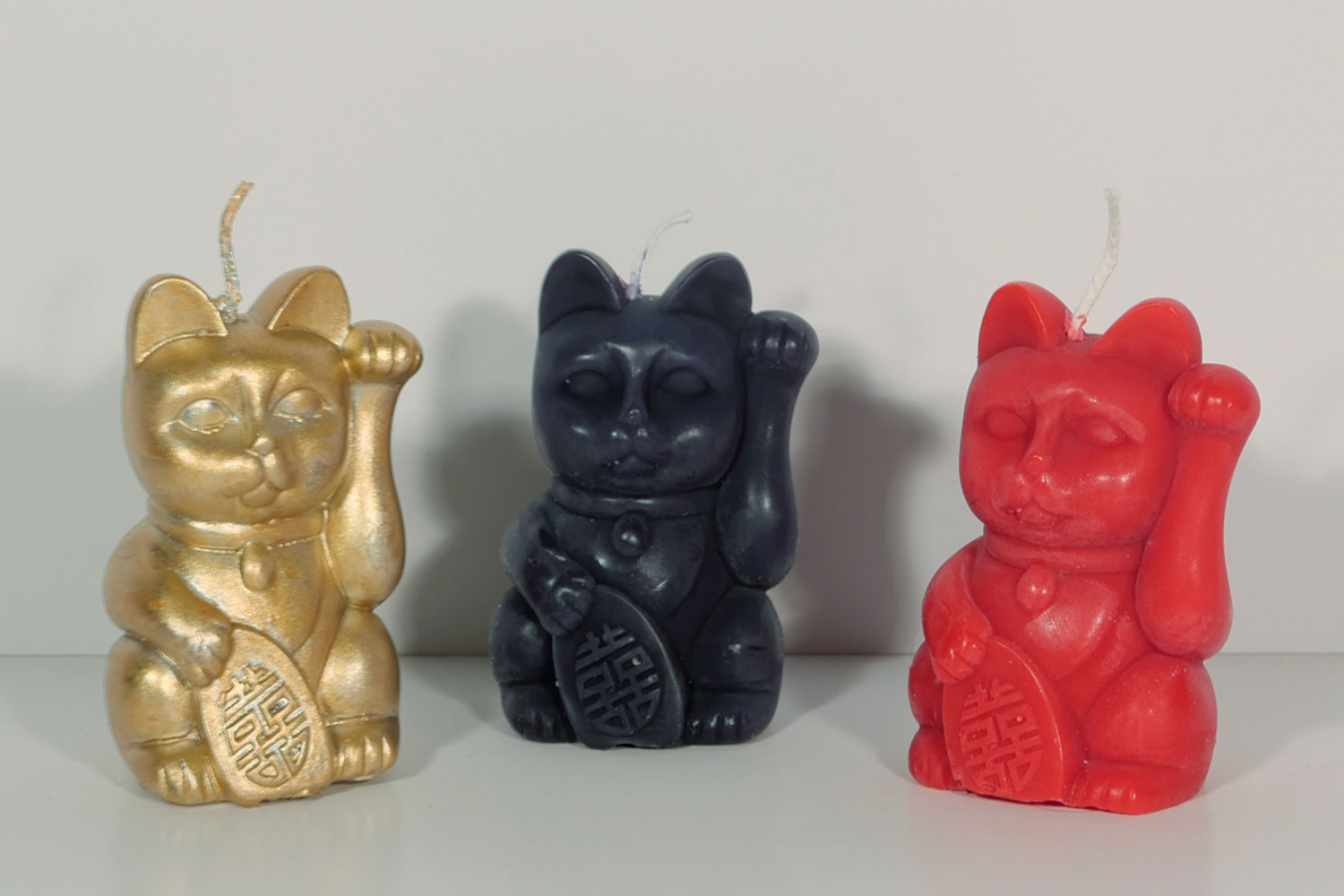 Die Winkekatze winkt in Gold den Reichtum herbei und vertreibt in rot Krankheiten.