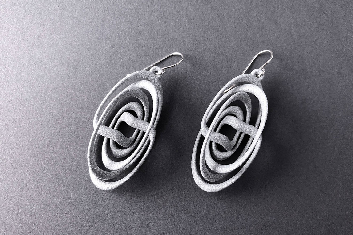 Ohrringe mit einer leichten, raffinierten Konstruktion, die subtil mit Perspektive und Bewegung spielt.