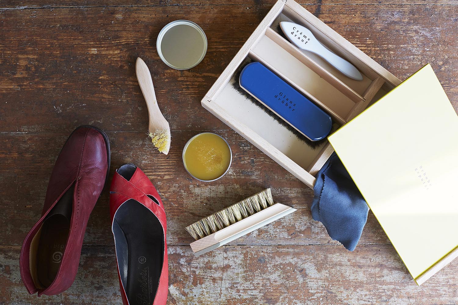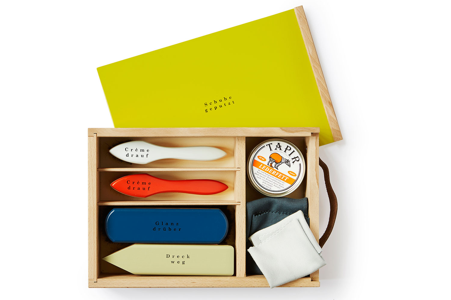 Inhalt: Schuhputzbürste, Glanzbürste, 2 Schuhcrèmebürsten, 2 Poliertücher, Schuhfett