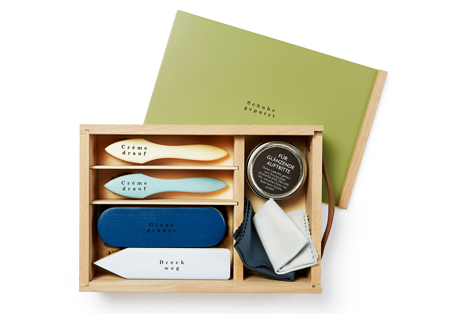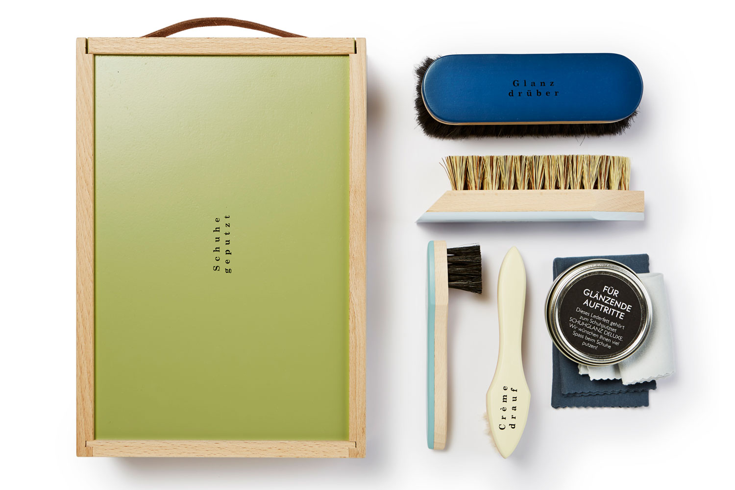 Nachdem das Schuhputzset Schuhglanz bereits für viele glänzende Auftritte gesorgt hat, gibt es neu die Deluxe Ausführung. Das Set beinhaltet nun auch ein Schuhfett und ein zweites Poliertuch. Die verschieden farbig lackierten und beschrifteten Bürsten sind in einer grösseren, tragbaren Holzbox chic verstaut, welche auch noch Platz für die eigenen Schuhputz-Utensilien lässt. Handgemacht im Blindenheim Horw.